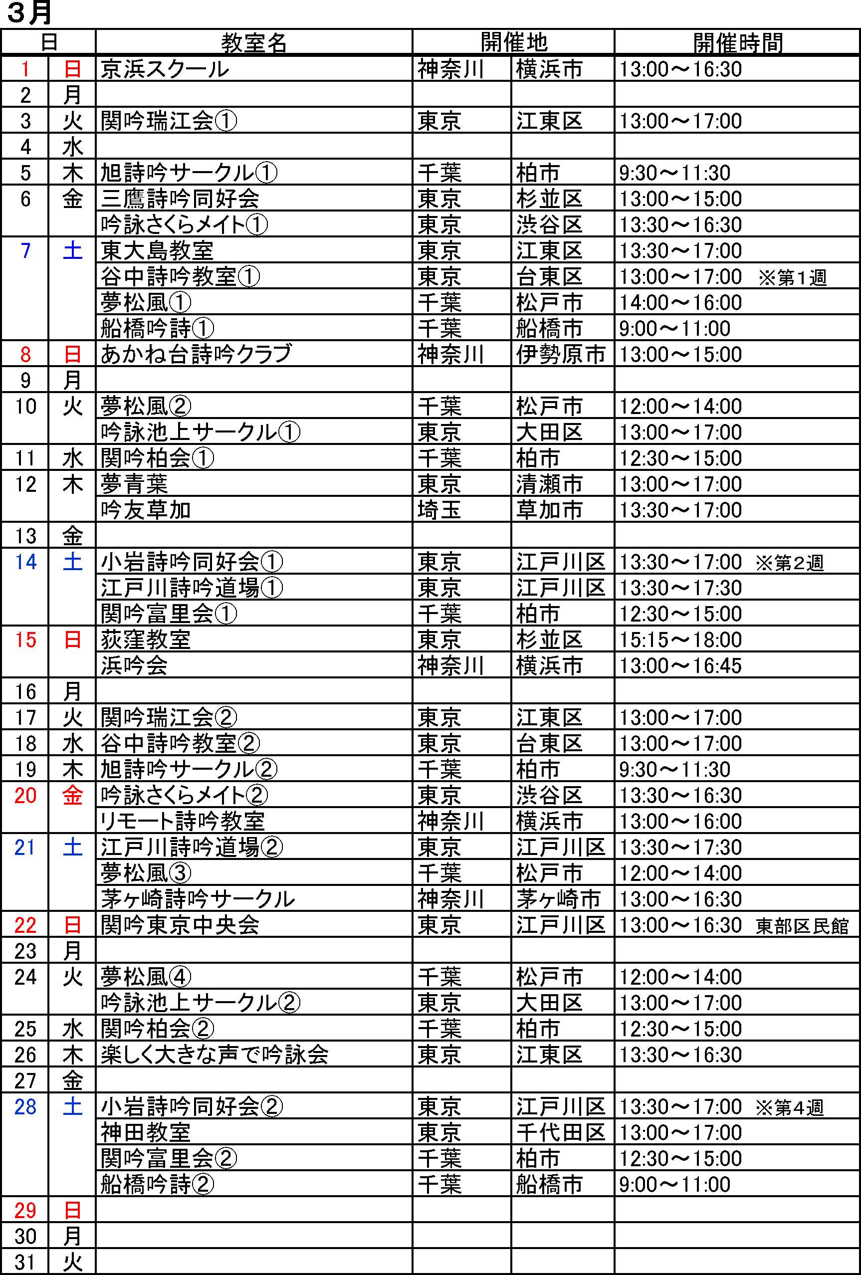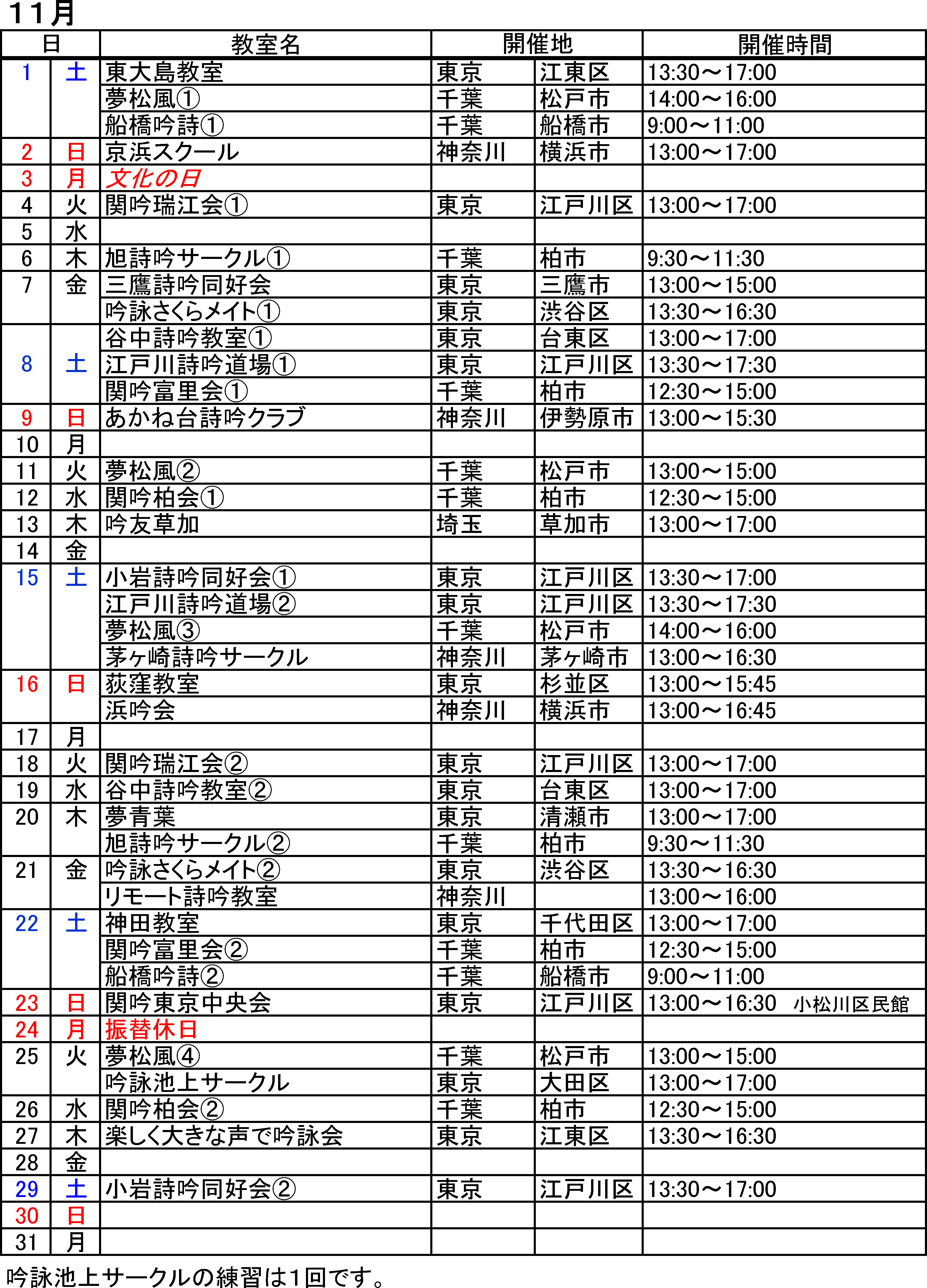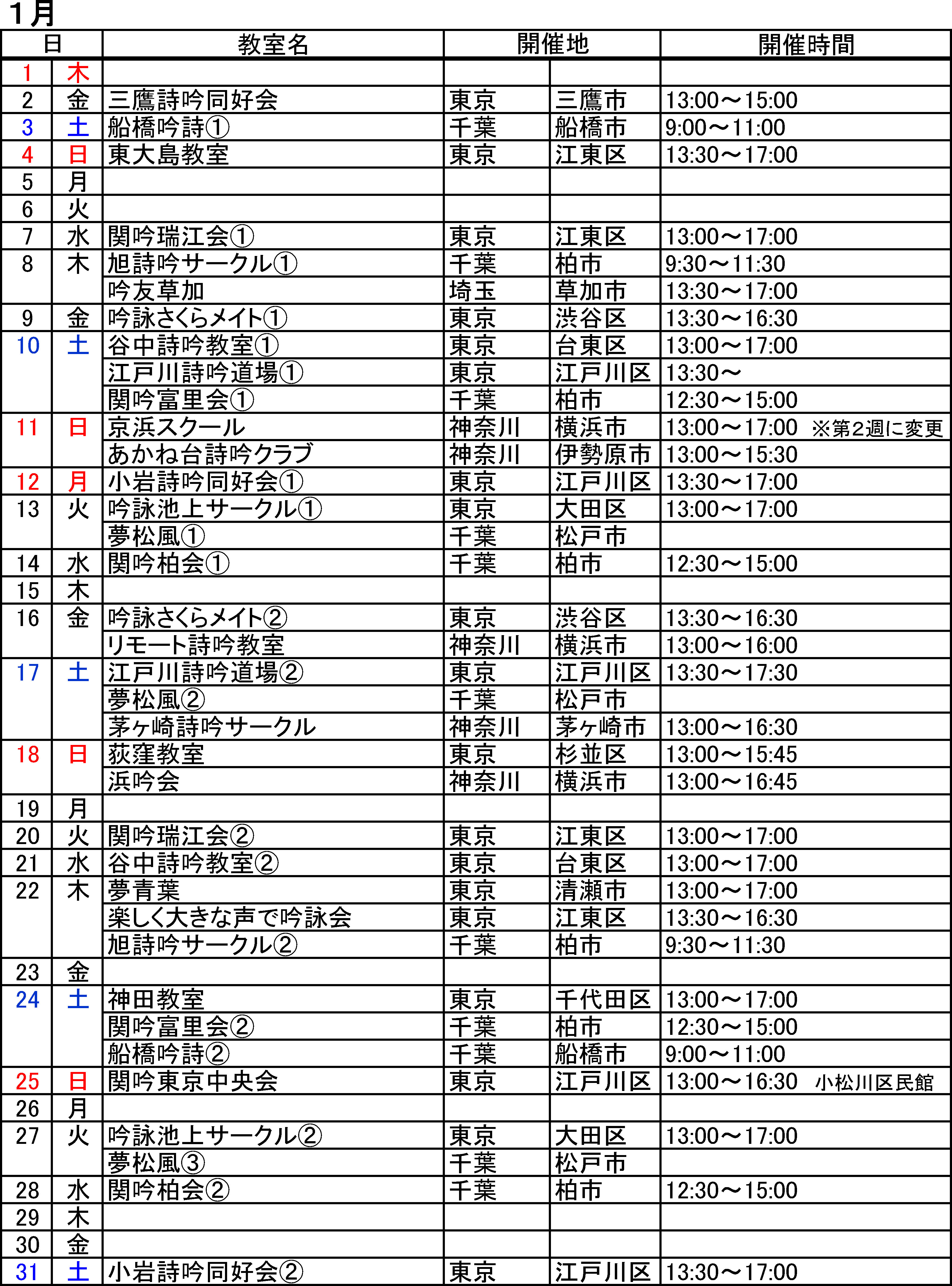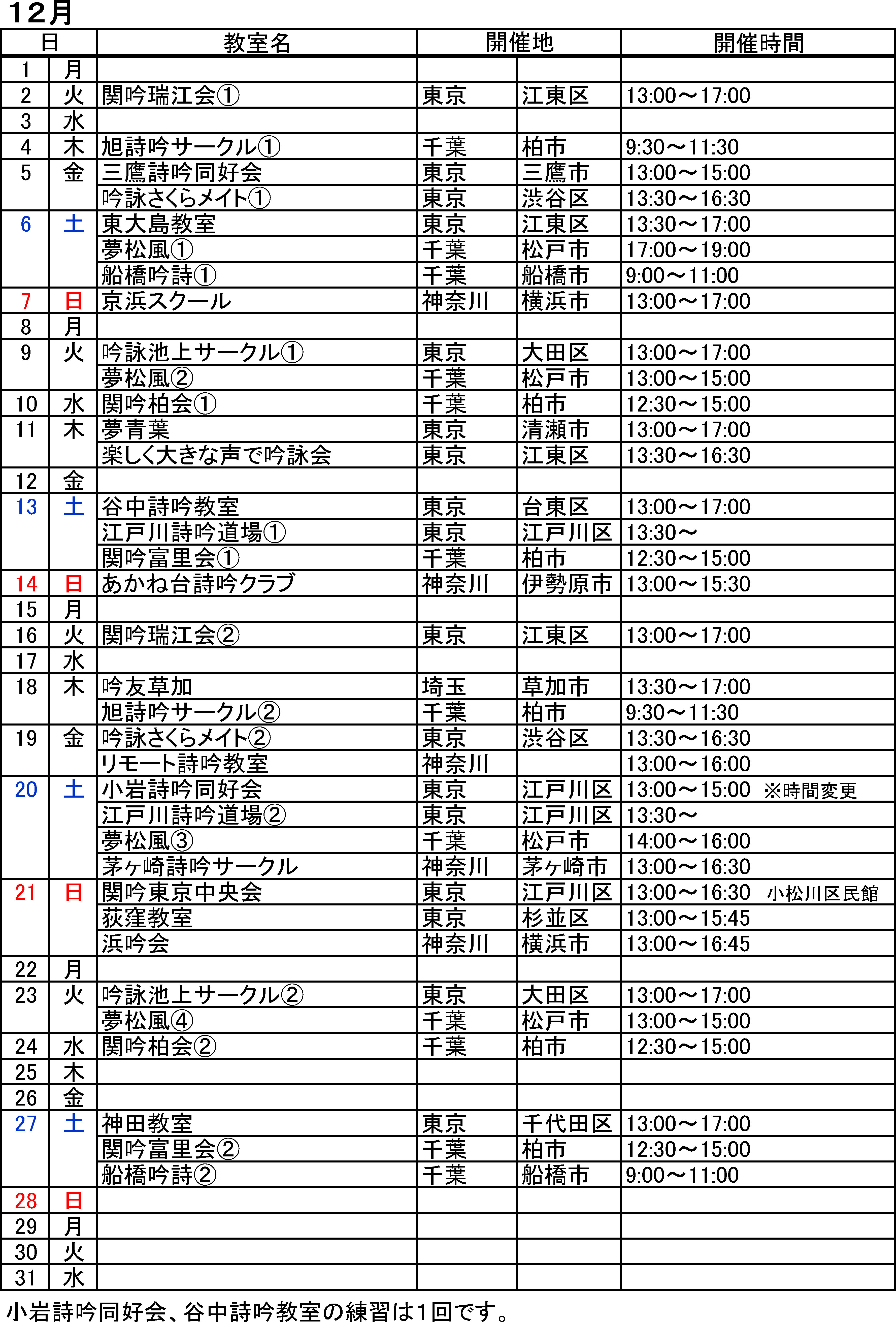・各教室の概要は教室紹介をご覧ください。 ・教室により月間の練習回数が異なります(1回~4回)。 ・日時は変更されることがあるので事前にお問合せください。 ※見学をご希望の方は前もってお問い合わせいただきますようお願い申し上げます。